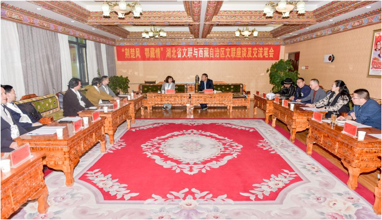 28日-29日,湖北省文联代表团一行专程前往拉萨,参观了西藏美术馆,观看了“岁月凝眸——庆祝西藏自治区成立60周年”第十八届西藏珠穆朗玛摄影大展、“繁华竞放”——新时代全国摄影精品展(拉萨站)、“乡村贵州的视觉密码”贵州美术馆馆藏农民画展等展览,并与西藏自治区文联开展座谈交流,鄂藏两地文联负责人和文艺家就鄂藏文化交流、文艺人才培养、文艺项目合作、共促民族文化繁荣等方面进行了充分的探讨和交流。