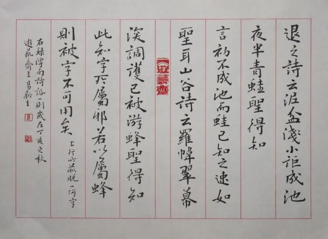 为纠正这种倾向,易新生提出了具体的实践方案:“晨读养文心,暮临练笔力。”晨读的内容不仅包括书法理论,更涵盖《文心雕龙》《诗品》等文学经典;暮临的练习不仅是法帖,更是自作诗文的书写实践。他以自身经历为例:“曾专攻《张迁碑》五年未换帖。书艺如栽苗,深耕比广种更重要?!闭庵帧奥钗颉钡奶龋淇此朴氲贝旖谧嗟难胺绞较嚆#翟蚯兄辛耸榉ㄑ暗谋局省榉ㄊ且幻判枰奔涑恋淼囊帐?,其核心不在于技法的速成,而在于文化的积累与人格的修炼。