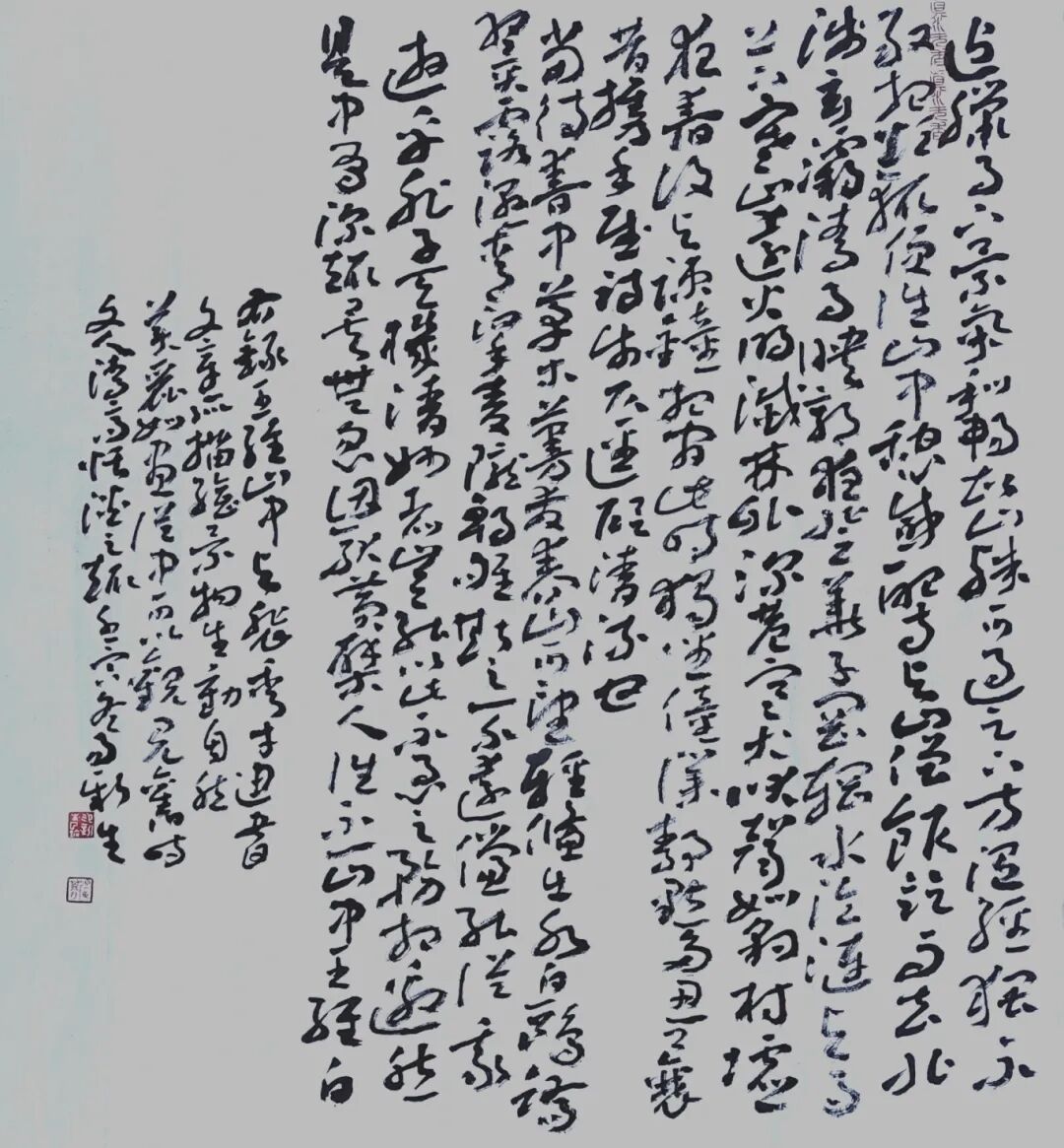 书画同源的体悟,是易新生艺术转型的关键。他在《书写的感觉》中分析:“绘画的疏密构图、虚实相生之理,与书法章法天然相通?!闭庵挚缑浇榈囊帐趺舾校顾谑榉ù醋髦惺贾兆⒅卣宀季帧蘼凼翘醴淖菔苹故呛崤暮崾?,无论是单字的结体还是全局的呼应,都能看到绘画思维对其的深刻影响。但真正让他实现突破的是“以文养墨”的实践:为深研书艺,他系统阅读古代书论并撰写文章,在梳理书学脉络的过程中,意外打通了文脉与墨韵的内在关联。